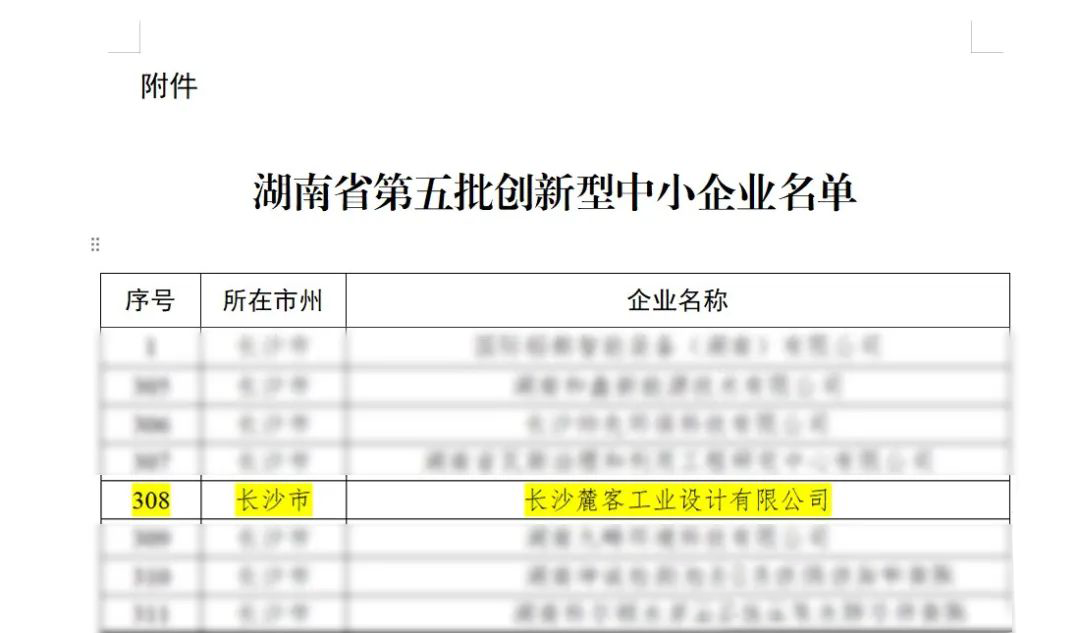 ? ? ? ? 近日,湖南省工業(yè)和信息化廳公布“湖南省2023年第五批創(chuàng)新型中小企業(yè)”名單,長(zhǎng)沙麓客工業(yè)設(shè)計(jì)有限公司(以下簡(jiǎn)稱“麓客”)被確定為湖南省第五批創(chuàng)新型中小企業(yè)。